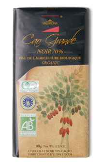 オーガニック・チョコレートのカオグランデ・ノワールは苦味、酸味、黄色いフルーツの香りが特徴のバランス良い風味。ヴァローナならではの風味の良さを追求したオーガニック・チョコレート。有機認定機関の認証を受けた農園で栽培された良質のカカオ豆のみを使用。
