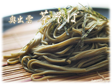 人気の奥出雲蕎麦に島根県産の緑茶を練りこんで作った「茶そば」 自家製粉の挽き立ての国産そば粉、国産小麦粉を使用。ほのかなお茶の風味をお楽しみ下さい。