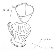 - 三つ穴ドリッパーの場合、フィルターの紐をドリッパーの持ち手に合わせて、取手どうしが重なる方向で、縫い目がドリッパーの底辺に直角になるようにセットします。(図)
