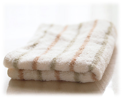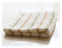 三重県津市にあるおぼろタオルさんで丁寧に時間を掛けて作って頂きました。 その名の通り、ホロッとしたタッチはおぼろタオルさんだけが持つ技です。 一般的なパイルはループがキチンと整列していますがおぼろさんのタオル織機で織ったパイルはひとあじ違います。程よい密度で、ランダムに色々な方向になびいています。 その為とてもしなやかで、やさしい肌触り、そしてなによりも薄く軽い仕上がりが 特徴です。 オーガニックコットンの3原色と呼んでいますがナチュラルをべースに ブラウン、グリーンのストライプのラインが爽やかです。