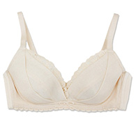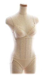 レーシーを強調し大人の女性らしさを追及しています。レースは柄がくっきりで透明感を出す特殊な編み機で作られています。レースのちくちく感が出ないよう身生地の上に重ね、直接肌にあたりません。 ワイヤーが苦手な人に優しい前角継ぎ・楕円形のノンワイヤー。ソフトな着用感なのにしっかり胸を支え、安定感があります。