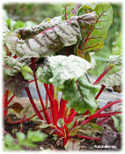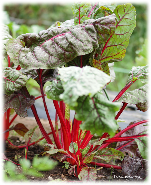 スイスチャードレッドとも呼ばれる、赤色の茎と深緑の大葉が特徴の一年草の葉野菜です。炒め物やお浸しでおいしくいただけます。